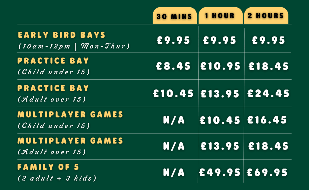 Great value for money, friendly staff and helpful. Loads of free parking, food and drink available. Fantastic screens to show your shot with distance