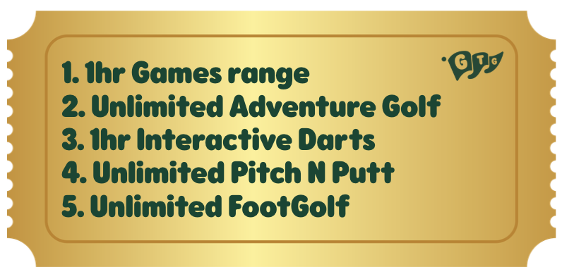 The All Day Pass is your golden ticket to everything we’ve got — Games Range, Adventure Golf, Interactive Darts, Pitch N Putt, and FootGolf.