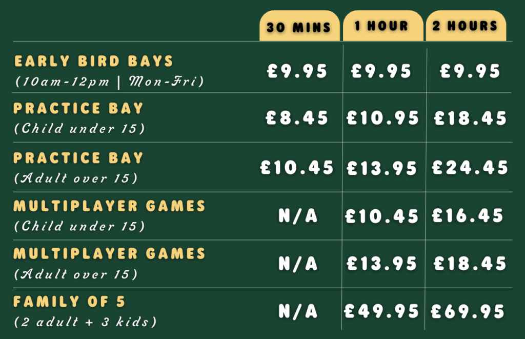 Each bay has its own table, sofa and even a heater so make up a party, bring your family and friends. The games are suitable for children, teenagers and adults, individuals, groups and parties. It’s an immersive golf gaming experience you don’t want to miss!